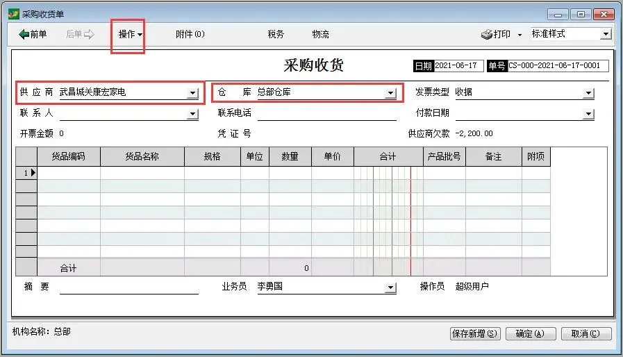 注意:只有选择订单以后自动带过来的货品才会与订单关联,手动增加的明细货品,即使与订单货品相同,也与订单无关,即订单依然会显示该货品未收货