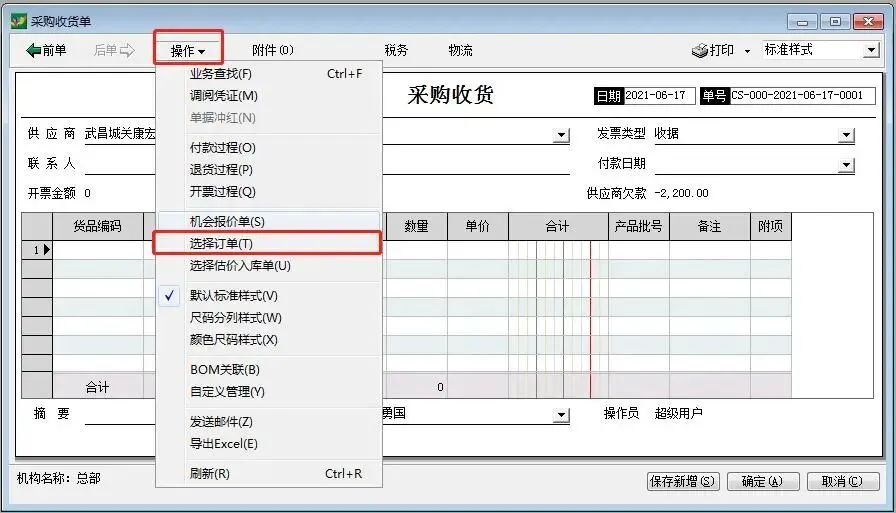 如果之前开了采购订单,那么可以点击操作——选择订单,