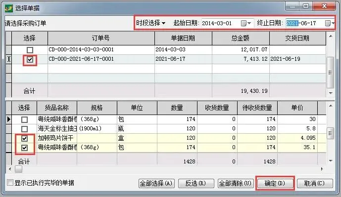 选择时间段,将相关订单勾选,确定——引入单据明细中