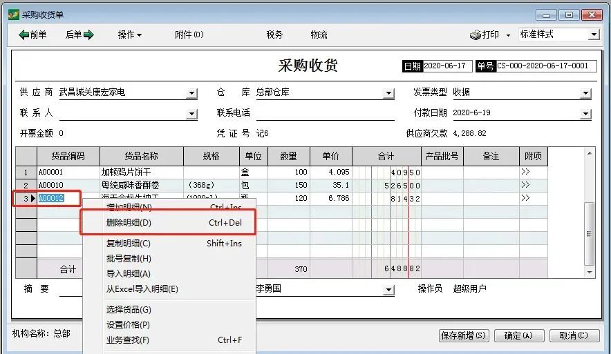 右键这一行货品,点击删除明细,即可删除该行