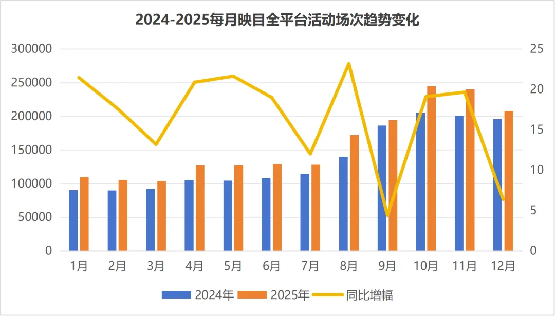 2025年映目全平台累计服务活动189万场,涵盖会议、会展等全行业、全类型活动,同比增长12.6%,涵盖照片直播、视频直播、活动管理系统等多元服务类型,彰显会议会展行业市场需求的持续旺盛。从全年场次时间分布来看,行业“淡旺季”分界尤为明显,9-12月活动场次占全年总量的46%,其中10月、11月达到全年峰值,反映出年末商务总结、行业峰会、节庆活动等集中举办的特征,旺季服务需求爆发力突出。