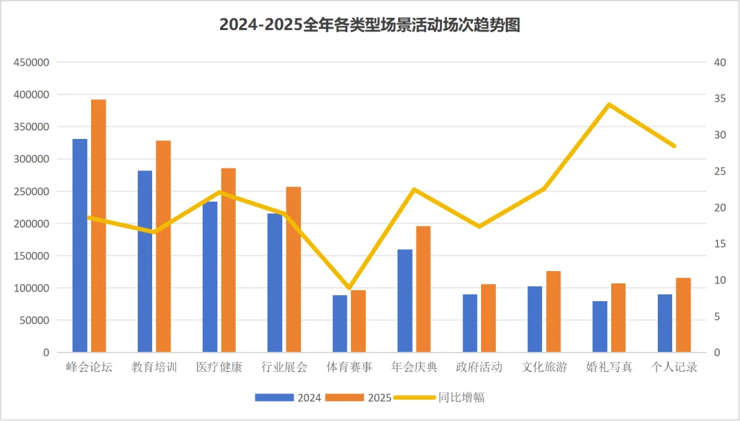 从活动类型分布来看,呈现“核心场景稳固、新兴场景扩容”的格局。“峰会论坛”“教育培训”“医疗健康”三大类型持续领跑,合计占比达53%,构成行业服务的稳定基本盘,体现出会议会展服务在商务交流、专业培训、健康产业等刚需场景中的深度渗透。与此同时,“婚礼写真”“个人记录”等个人消费类场景需求显著增长,同比增幅分别达34%、28%,反映出会议会展服务从 B 端商务场景向 C 端个人场景延伸的多元化趋势。