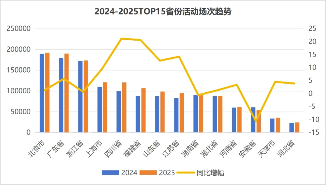在TOP15省份的活动场次分布中,区域发展分化特征明显。北京、广东、浙江作为传统会展大省,2025年活动场次占比合计达35%,但增速均放缓至10%以内,标志着这些地区市场已进入存量深耕阶段,行业竞争从规模扩张转向服务品质与效率的比拼。