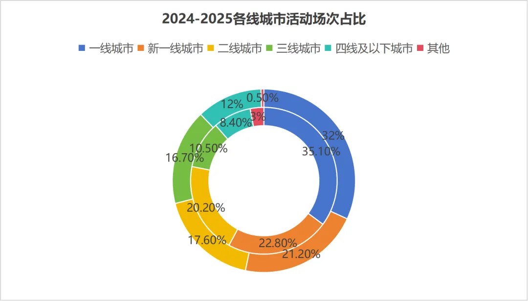 从城市线级分布来看,一线、新一线城市作为会议会展行业核心市场,活动场次占比稳定在52%左右,成熟市场的存量竞争特征日益显著。