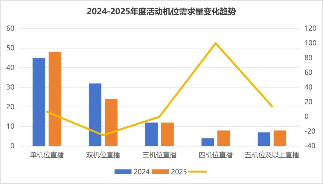 2025年,单/双机位直播仍占据主要直播方式,表明活动举办需求仍偏向精简、高效。同时3机位及以上直播活动占比达28%,同比增长22%,其中5机位以上大型活动占比达8%,主要集中在行业峰会、大型展会、体育赛事等场景。多机位直播能够实现不同角度、不同场景的同步呈现,提升观众的观看体验,满足主办方对活动专业化呈现的需求。
