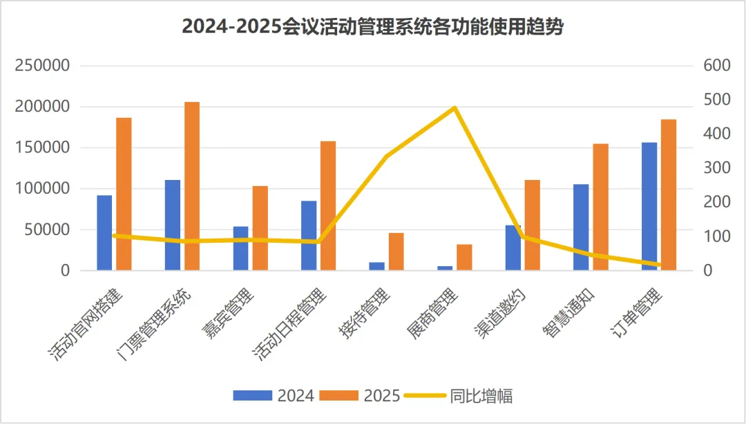 此外,展商管理、接待管理等功能的使用率也显著提升,反映出主办方对活动管理数字化、高效化、精细化的追求。越来越多的主办方意识到,会议活动管理系统已从“可选工具”转变为“必备工具”,成为提升活动组织效率、优化参与者体验的重要支撑。