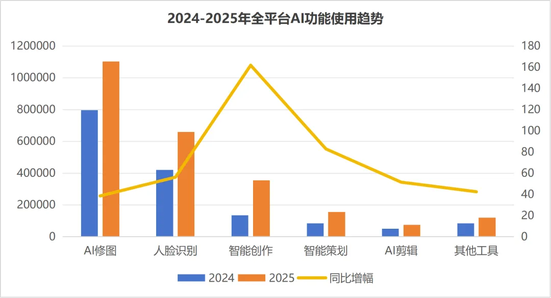 AI剪辑使用率同比增长51%,通过智能识别精彩片段、自动匹配背景音乐、快速生成短视频,满足了即时传播的需求,大幅提升了内容生产效率。