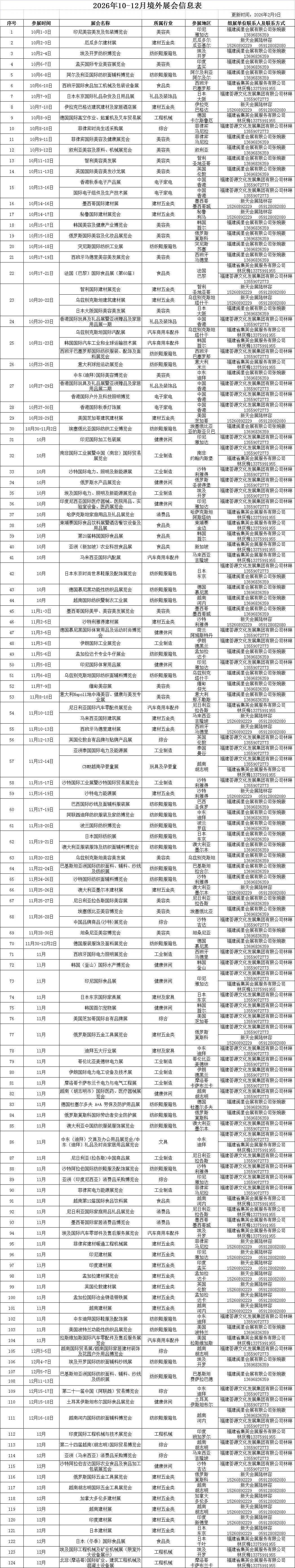 为帮助企业开拓国际市场,争取更多订单,小编将收集发布境外展会信息供企业查阅,各企业可根据自身需要选择。第四期为2026年10-12月国外展会信息,共计124个展会,涵盖食品、建材、家具、美容、婴童用品和玩具等多个行业,涉及美国、俄罗斯、德国等多个国家及地区。如有兴趣,可详询组展单位。