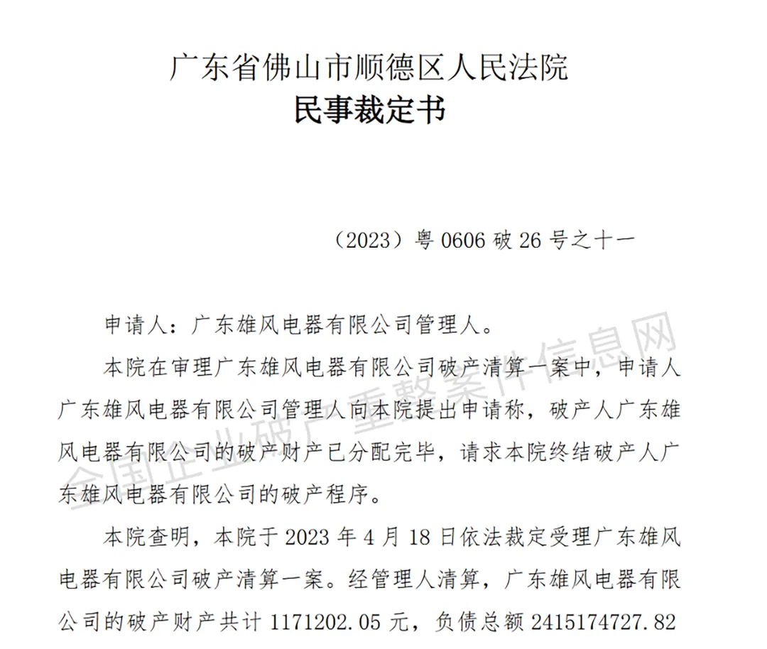 【突发!广东23年老牌电器厂破产,彻底退出市场】宝子们!大消息!经营了23年的广东雄风电器,居然破产退出市场了!谁能想到,这家2002年就注册成立的老厂,曾经把生意做到全国多个省市,还开了不少分公司、子公司,专门做电器研发、制造和销售,在行业里也算有头有脸。可如今,它被顺德区人民法院依法裁定破产,彻底告别了经营23年的舞台。从扎根市场的老牌企业,到无奈退出的破产厂家,这反差真的太让人唏嘘。没有复杂的专业说法,就是实实在在的一个老厂落幕,不知道多少人曾用过它家的电器。
