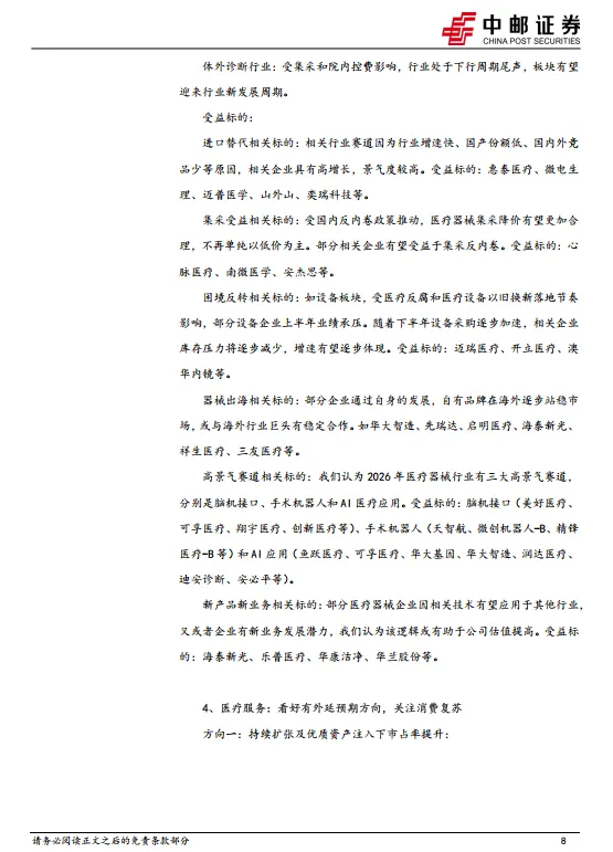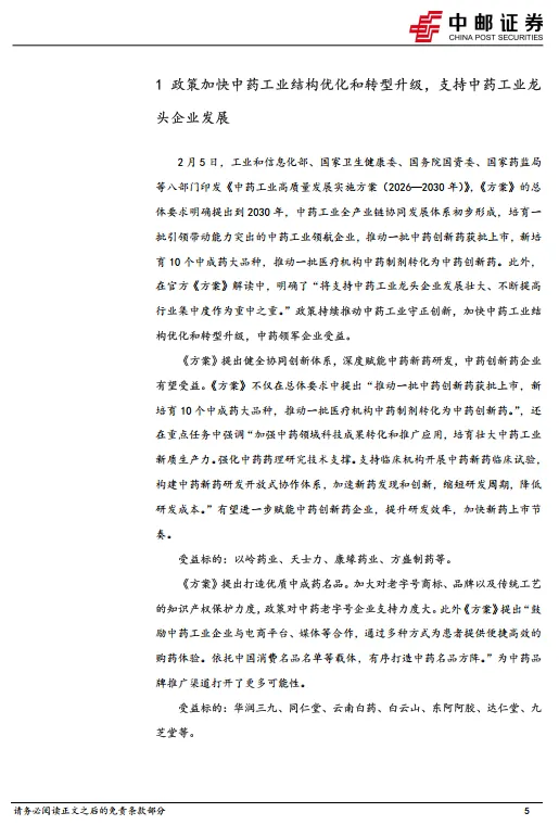 2月5日,工业和信息化部、国家卫生健康委、国务院国资委、国家药监局等八部门印发《中药工业高质量发展实施方案(2026—2030年)》,《方案》的总体要求明确提出到2030年,中药工业全产业链协同发展体系初步形成,培育一批引领带动能力突出的中药工业领航企业,推动一批中药创新药获批上市,新培育10个中成药大品种,推动一批医疗机构中药制剂转化为中药创新药。此外,在官方《方案》解读中,明确了“将支持中药工业龙头企业发展壮大、不断提高行业集中度作为重中之重。”政策持续推动中药工业守正创新,加快中药工业结构优化和转型升级,中药领军企业受益。《方案》提出健全协同创新体系,深度赋能中药新药研发,中药创新药企业有望受益。受益标的:以岭药业、天士力、康缘药业、方盛制药等。