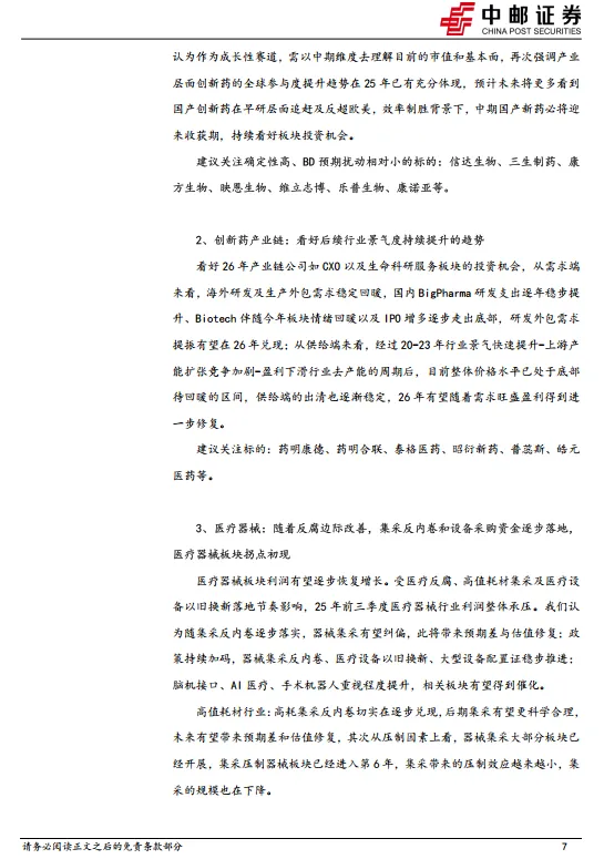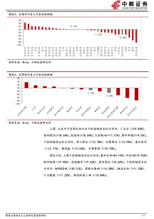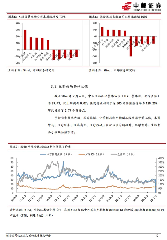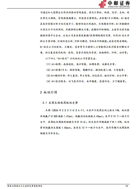 本周(2026年2月2日-2月6日),A股申万医药生物上涨0.14%,板块整体跑赢沪深300指数1.47pct,跑赢创业板指数3.43pct。在申万31个一级子行业中,医药板块周涨跌幅排名为第15位。恒生医疗保健指数下跌1.37%,板块整体跑赢恒生指数1.65pct。在恒生12个一级子行业中,医疗保健行业周涨跌幅排名为第8位。1、创新药:创新药板块在年初回暖之后有所回调,预计仍主要是以资金面因素有关,根据近期公募基金Q4持仓来看,医药基主动和被动规模均有所下滑,医药行业持股比例环比Q3也略有下降,预计仍处于消化25年BD预期的阶段,而板块内部占比方面创新药仍处于较高水平,表明创新药仍是目前基本面最佳的选择。我们认为作为成长性赛道,需以中期维度去理解目前的市值和基本面,再次强调产业层面创新药的全球参与度提升趋势在25年已有充分体现,预计未来将更多看到国产创新药在早研层面追赶及反超欧美,效率制胜背景下,中期国产新药必将迎来收获期,持续看好板块投资机会。建议关注确定性高、BD预期扰动相对小的标的:信达生物、三生制药、康方生物、映恩生物、维立志博、乐普生物、康诺亚等。2、医疗器械:从整体生物医药板块中看,创新药资金拥挤度相比Q2略有下降,部分资金从创新药暂时撤退,医疗器械整体行业格局尚可,有望成为资金流入板块。基本面方面,龙头企业Q3改善。如迈瑞上半年负增长,Q3正增长;开立医疗、华大智造、澳华内镜类似,行业大的标Q3业绩逐步改善。从压制因素上看,器械集采大部分板块已经开展,集采压制器械板块已经进入第6年,集采带来的压制效应越来越小,集采的规模也在下降,未来有望带来预期差和估值修复。体外诊断板块,受集采和院内控费影响,行业处于下行周期尾声,板块有望迎来行业新发展周期。3、中药:业绩阶段性承压,看好集采/基药政策受益、创新驱动、高基数出清方向,流感受益。受益标的:佐力药业、特一药业、方盛制药、众生药业、康缘药业、天士力、贵州百灵、九芝堂、桂林三金、以岭药业、贵州三力。4、AI+医疗:在制药领域,凭借AI技术平台强大的数据分析和模型预测能力,相关公司在分子设计和药物筛选方面能够大幅提升药物的研发效率和成功率。AI制药公司通过和大型药企合作共同推动管线进展,涉及计算机、物理、化学、生物、临床等交叉领域,管线推进越靠后,价值量显著增高。在影像/手术领域:AI通过在医疗影像分析方向深度学习,能够快速识别病灶,实现精准诊断;AI亦能辅助术前及术中及时规划,并提供综合解决方案。在辅助诊断领域,主要参与者为数据驱动型平台企业,此类公司在高质量数据/医药领域拥有优势,利用AI技术并结合专家训练,实现快速分析、诊断及解读,为临床诊断赋能。在医疗服务领域,AI相关公司向医院、卫健委、患者等多方提供人工智能综合医疗服务和解决方案,助力基层医疗机构、医院、患者实现院内管理、疾病预防、诊断、治疗等。(1)AI+制药:晶泰控股、英矽智能、泓博医药、成都先导等;(2)AI+影像/手术:联影智能、鹰瞳科技、微创机器人-B、天智航等;(3)AI+辅助诊断:华大基因、华大智造、润达医疗、迪安诊断、安必平等;(4)AI+医疗服务:讯飞医疗科技、美年健康、医渡科技、卫宁健康等风险提示:创新药研发进度不及预期风险;市场竞争加剧风险;地缘政治风险;政策降价压力超预期风险等。证券研究报告:《行业周报:政策加快中药工业结构优化和转型升级,支持中药工业龙头企业发展》