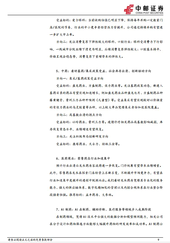 《方案》提出打造优质中成药名品。加大对老字号商标、品牌以及传统工艺的知识产权保护力度,政策对中药老字号企业支持力度大。受益标的:华润三九、同仁堂、云南白药、白云山、东阿阿胶、达仁堂、九芝堂等。
