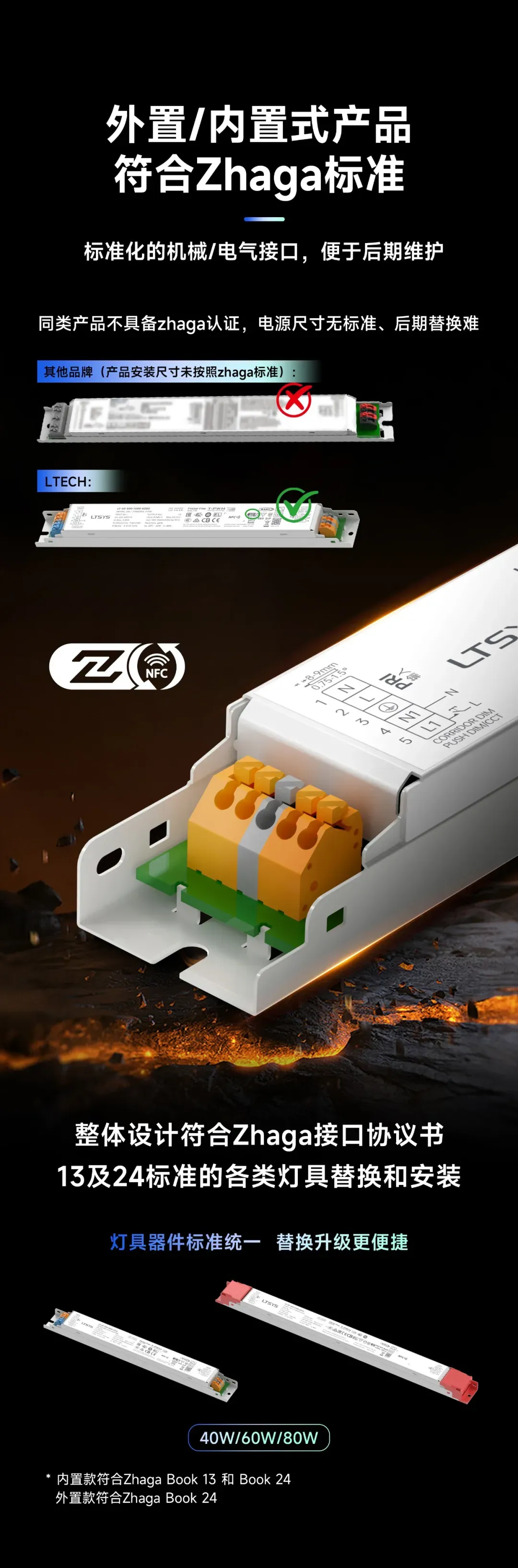 LF Series Linear Intelligent LED Drivers,Exclusively engineered for linear lighting fixtures.We offer two product lines: built-in and external versions,The overall design strictly complies with Zhaga Book 13 & Book 24 standards,enabling efficient replacement and easy installation for all types of lighting fixtures,Ideal for commercial applications including office buildings shopping malls and more.This series has obtained multiple authoritative certifications:TÜV, China CCC,as well as ENEC/CE/EL/CB (issued by German TÜV),and international certifications such as RoHS & EAC.A smart and optimal solution for office lighting projects.