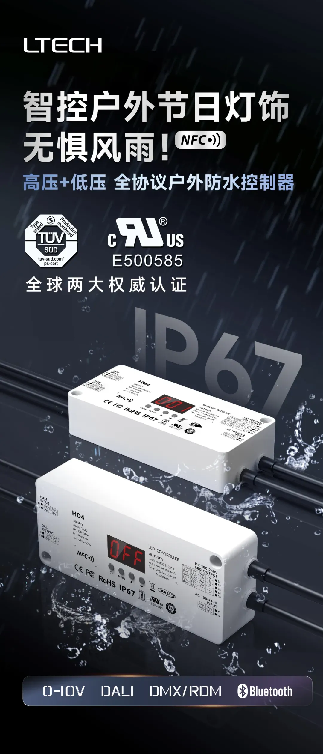 A matrix of waterproof controllers covering DALI,DMX,0-10V and Bluetooth protocols,Supports NFC near-field programming. the DMX series also supports RDM remote management eliminating the need for climbing and manual operation during outdoor engineering commissioning.Effortlessly handles complex scenarios such as building lighting and festive decorations.The product has passed international certifications including TÜV, UL, CE, FCC, ROHS, and BIS,remaining stable and reliable even in harsh environments.
