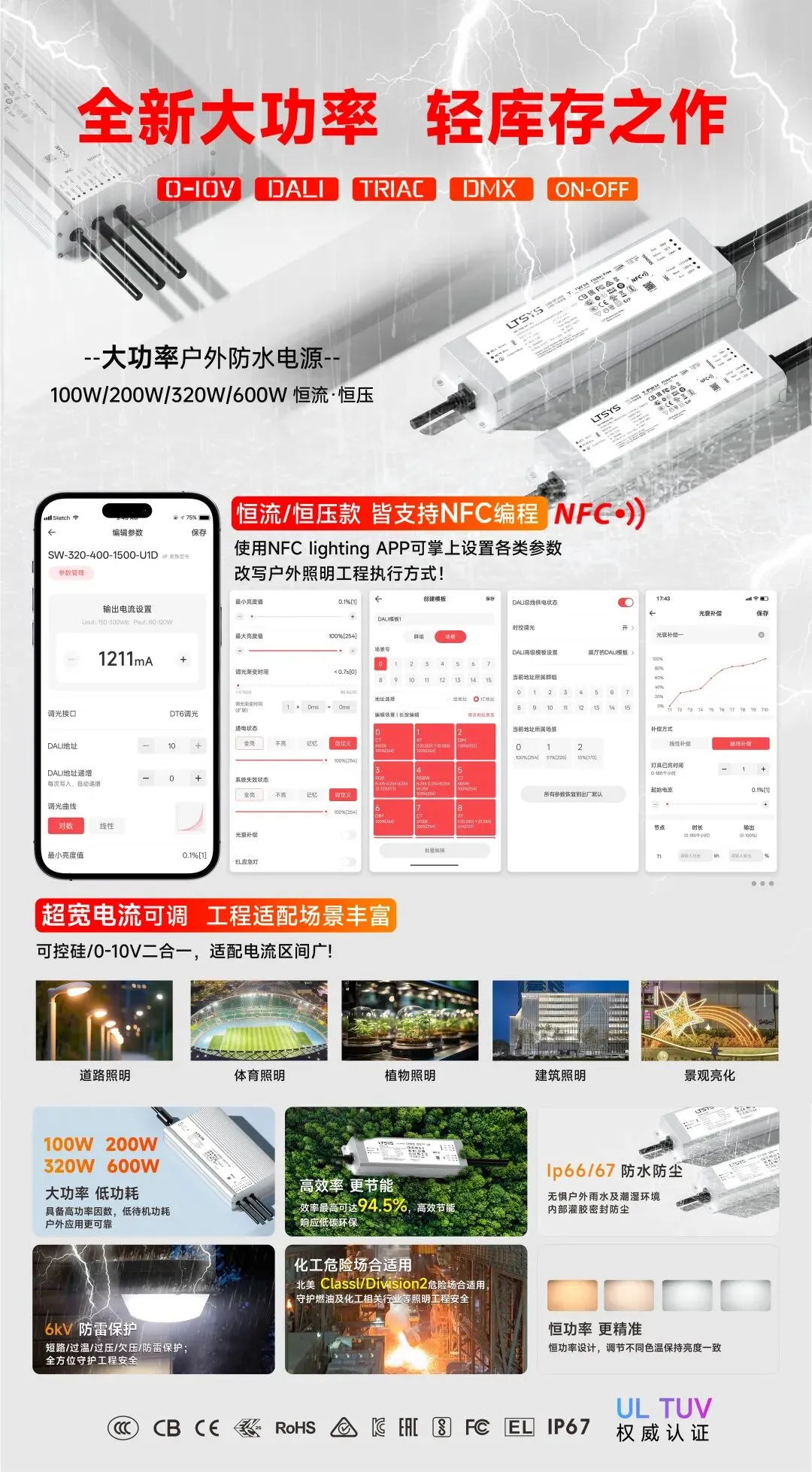 雷特智能电源技术加持,单系列产品覆盖户外防水电源多类规格需求,功率覆盖100-600W,支持0-10V/可控硅双协议切换。北美Class I, Division 2危险场合适用,守护燃油及化工等行业的照明工程安全。在NFC近场编程的加持下,无论是商业综合体的巨幕亮化,还是桥梁隧道的长效照明,均可高效、安全地落地。