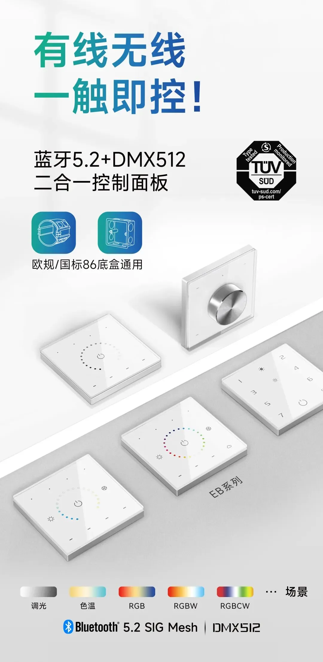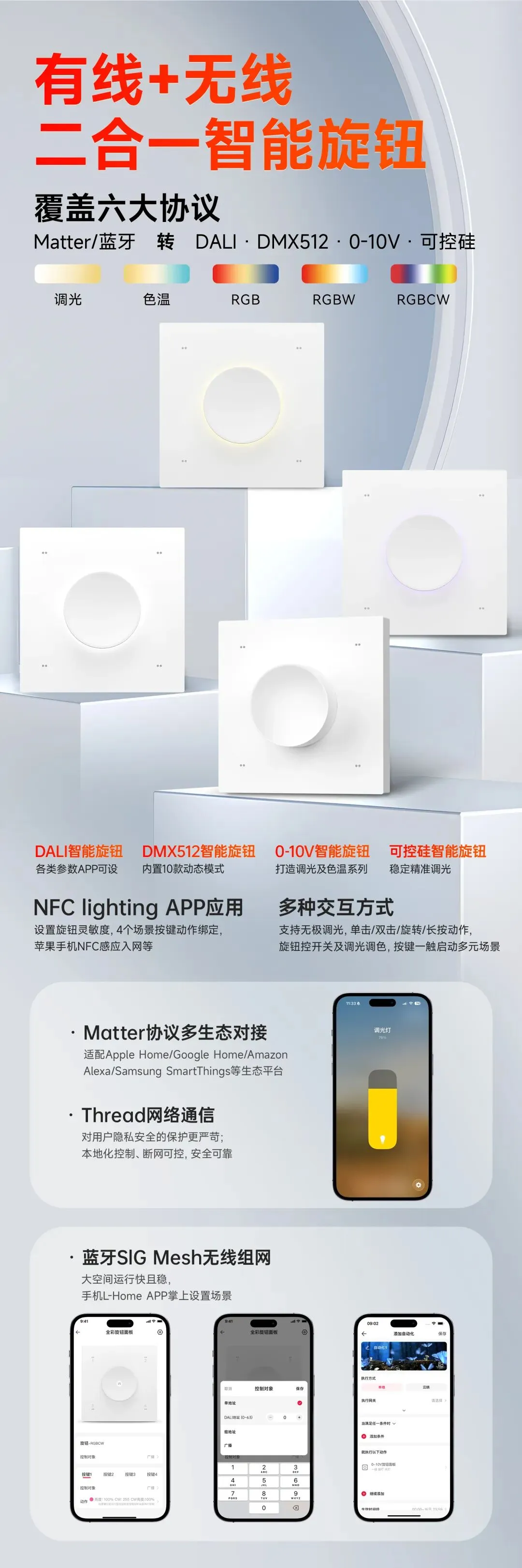 The series of knob products integrate DMX, 0-10V, DALI, and TRIAC four wired protocols making intelligent control of various lighting projects more convenient.Two major series are designed: Matter-to-wired protocol and Bluetooth-to-wired protocol.Compatible with the global Matter protocol ecosystem platforms such as Apple Home, Google Home, Amazon Alexa,Samsung SmartThings and L-Home.The knob supports stepless dimming and diverse interactions including single-click, double-click, rotation, and long press.Four scene keys enable quick access to a wide range of lighting effects.