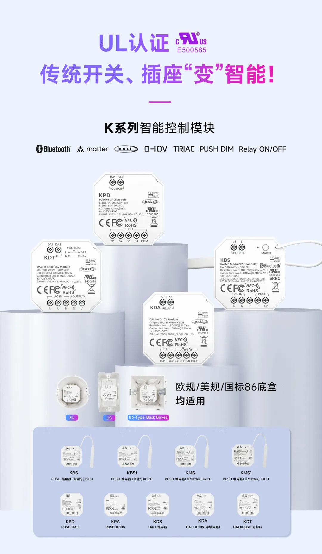The K Series Intelligent Control Module has passed UL certification is compatible with US/EU/Chinese standard junction boxes features a compact design that enables intelligent retrofit of traditional switches,when placed in the junction box,supports four major wired protocols including DALI, DMX, 0-10V, and Triac, as well as Bluetooth 5.0 wireless protocol and connects to open ecosystems such as Apple Home and Matter.It also allows traditional switches and reset switches to achieve dimmingand device control.