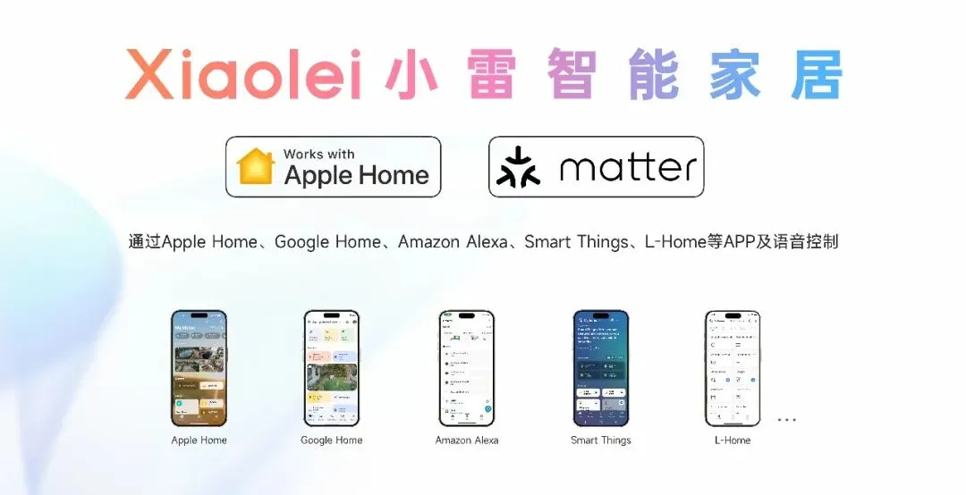 小雷智能家居打造原生Matter协议的智能家居系统,深度对接Apple Home生态。并打通Google Home/Amazon Alexa/Samsung SmartThings ,等全球开放生态平台。让全球更多品牌的智能设备实现跨界互联。