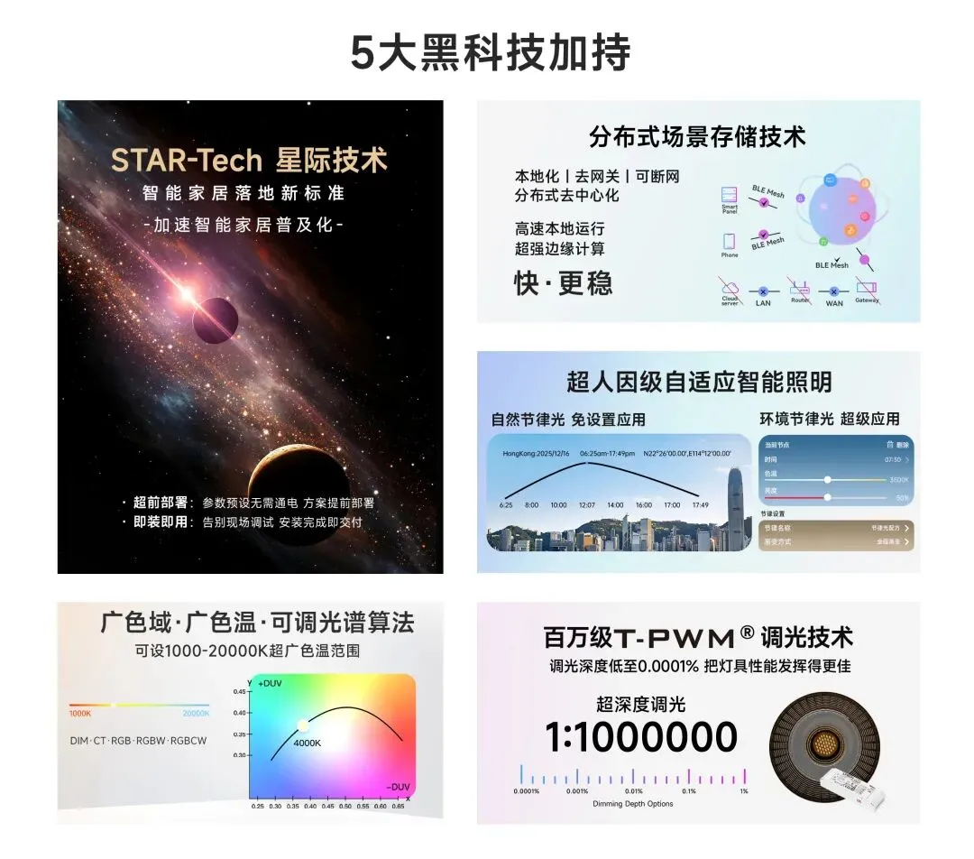 LTECH's core competitiveness stems from its relentless pursuit of innovative technologies,Empowered by five major black technologie:Distributed Scene Storage Super Human-Centric Adaptive Intelligent Lighting、T-PWM® Million-Level Super-Deep Dimming、RGBCW Wide Color Gamut and Wide Color Temperature Adjustable Spectrum Algorithm and STAR-Tech Interstellar Technology,it demonstrates strong technical strength.