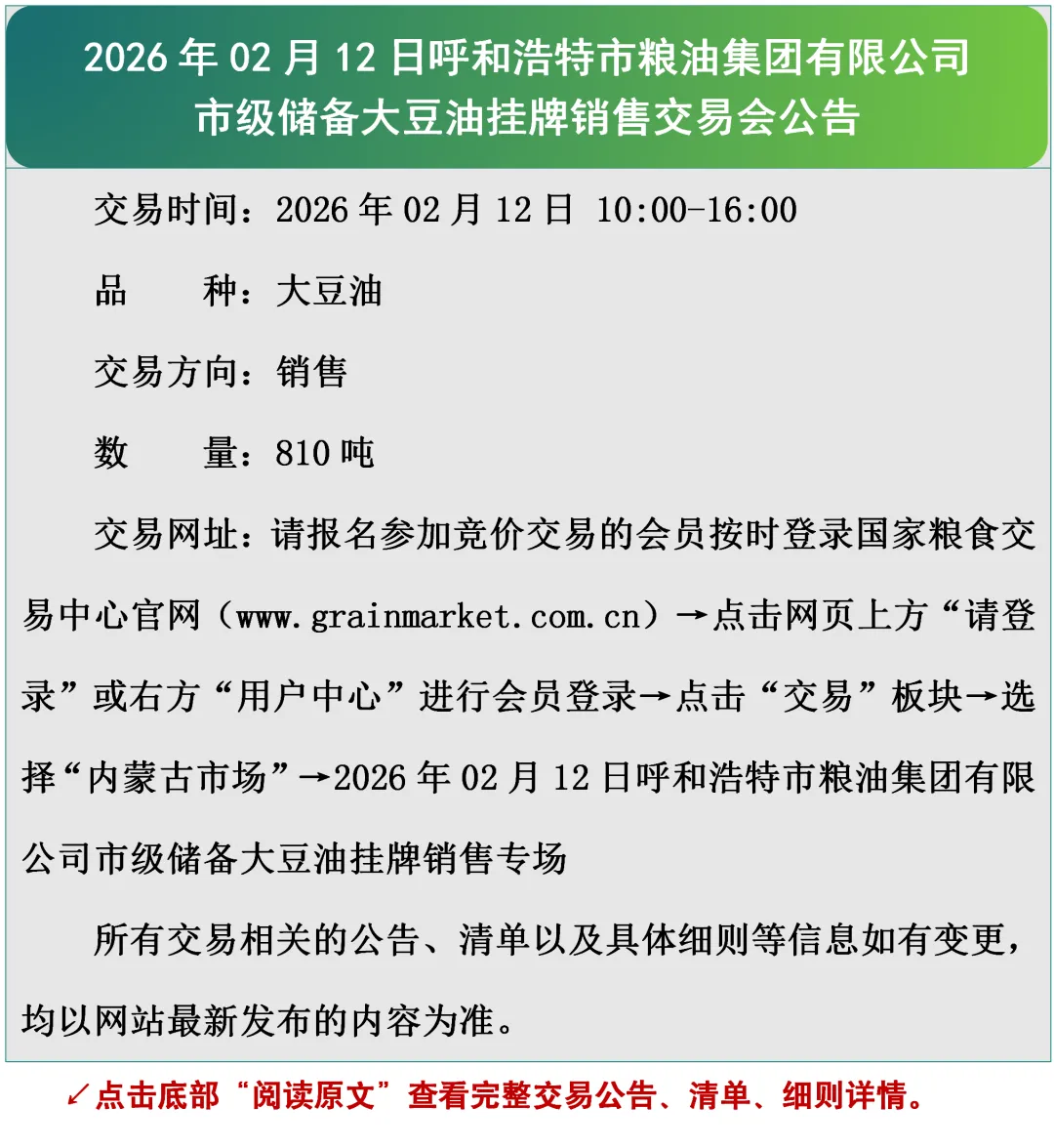 2026年02月12日呼和浩特市粮油集团有限公司市级储备大豆油挂牌销售交易会公告