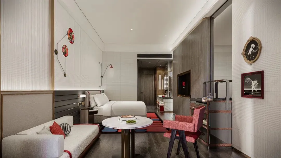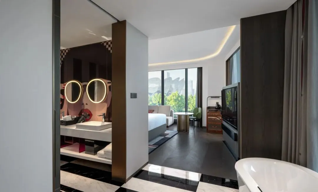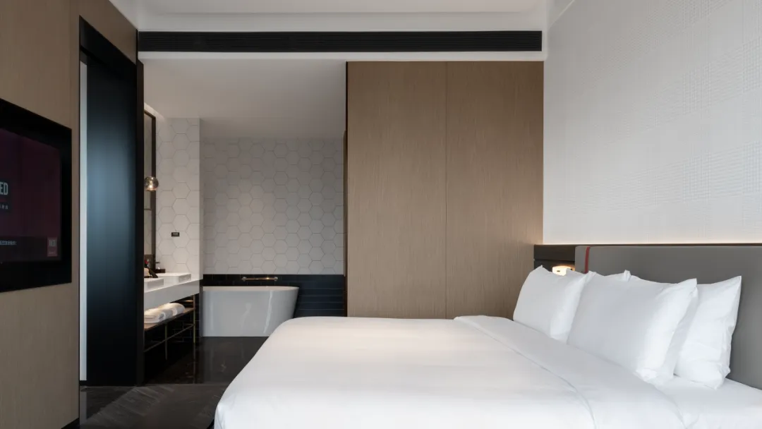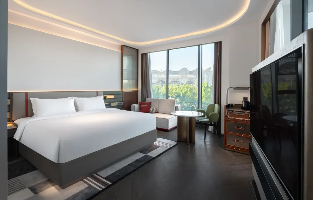酒店拥有133间不同类型的高端智能化客房,其中标间62间、大床房63间、套房8间,无论是单人参会、双人同行,还是家庭随行,都能找到契合选择。客房延续品牌潮趣格调与简约美学,大面积采光搭配柔软舒适的床品,搭配隔音效果极佳的门窗设计,隔绝外界喧嚣,安享一夜好眠。每间客房配备办公桌、高速WiFi、充电接口等商务设施,房间全系配备舒达床垫、戴森吹风机、MALIN+GOETZ天然洗护用品,细节之处彰显品质,兼顾实用性与仪式感。