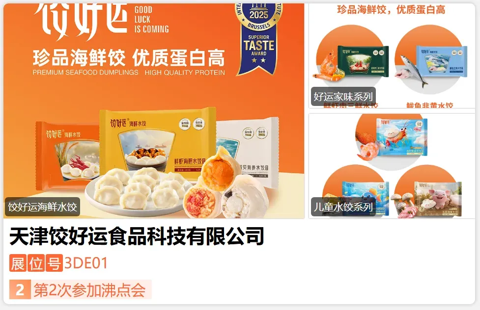 饺好运,天津百饺园30年经典传承,以匠心精艺与美味创新重新定义高品质速冻水饺。“高蛋白,珍品海鲜水饺”开创者,拥有:四重无添加、高蛋白认证、馅含量≥65%(行业No.1)等核心卖点,入选央视新国货榜样,获国家商务部“信用+”认证,成为“营养、健康、美味”的新时代行业典范。斩获ITI国际美味奖,连续成为达沃斯论坛受邀品牌,让世界品味中国味道,共享中国好运!-展位号:3DC02-