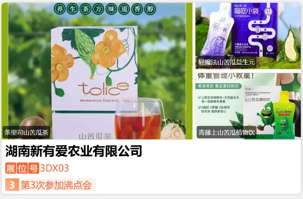 湖南新有爱是国内山苦瓜全产业链开发双龙头(国家高新+农业产业化),集“产学研销”一体,拥有万亩有机山苦瓜基地及2.65万㎡工厂园区,年处理山苦瓜原材1万吨,产值4.6亿。联合湖南大学、湖南农大建成“山苦瓜科技小院”,获68项专利(含10项发明)。配置GMP10万 级车间及万 级实验室,持有18项国际认证(含FDA、Halal),贯通全球市场。以科技赋能品质,领跑健康食品行业。-展位号:3DD01-