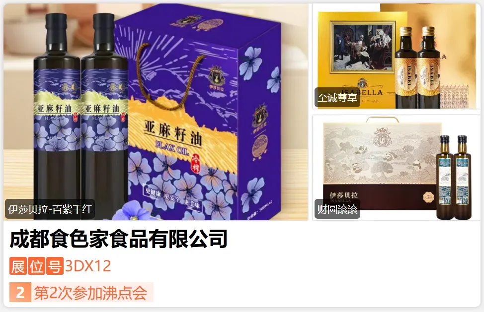 伊莎贝拉:得名于西班牙传奇女王伊莎贝拉一世,总部位于美丽的天府之国 成都,专注高端食用油研发、生产与销售。借大自然瑰宝,精研“伊莎贝拉橄榄油”“赣久久山茶油”“食色家亚麻籽油”“欧莉芙蓉核桃油”四大精品。-展位号:3DX09-