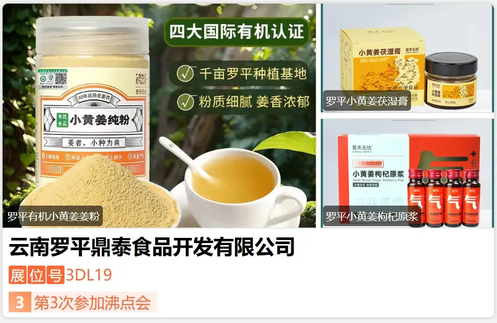 云南罗平鼎泰食品开发有限公司是专业从事小黄姜种植、科研、加工、生产及销售为一体的专业大型农产品经营企业。经过四十余年的经验沉淀,以万亩优质小黄姜种植基地为根基,以先进的生产设备为工具,以专业的科研团队为核心,立志成为姜品大健康践行者。目前,罗平鼎泰食品已经成为云南省少有的规模化、产业化、产学研一体化姜品重点龙头标杆企业,其麾下“姜来无忧”系列产品广受消费者欢迎,是行业内的领军品牌之一。-展位号:3DB25-