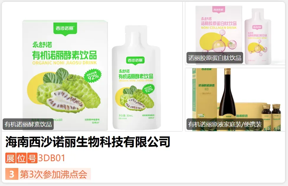 懿然生物旗下企业,10年专注一杯诺丽。诺丽行业第 一家出口诺丽果汁的企业,出口美国、韩国、欧洲等18个国家和地区,累计出口20000吨,拥有8000亩果园,其中有机果园1000多亩,年产有机诺丽2500吨,是国内唯 一有能力大量供应有机诺丽酵素果汁的企业。CCtTV7《致富经》专访企业,国内给千金药业,旺旺集团提供原料,合作代工品牌有同仁堂、济正堂......湖南卫视魏恺辰带货直播。-展位号:3DC26-