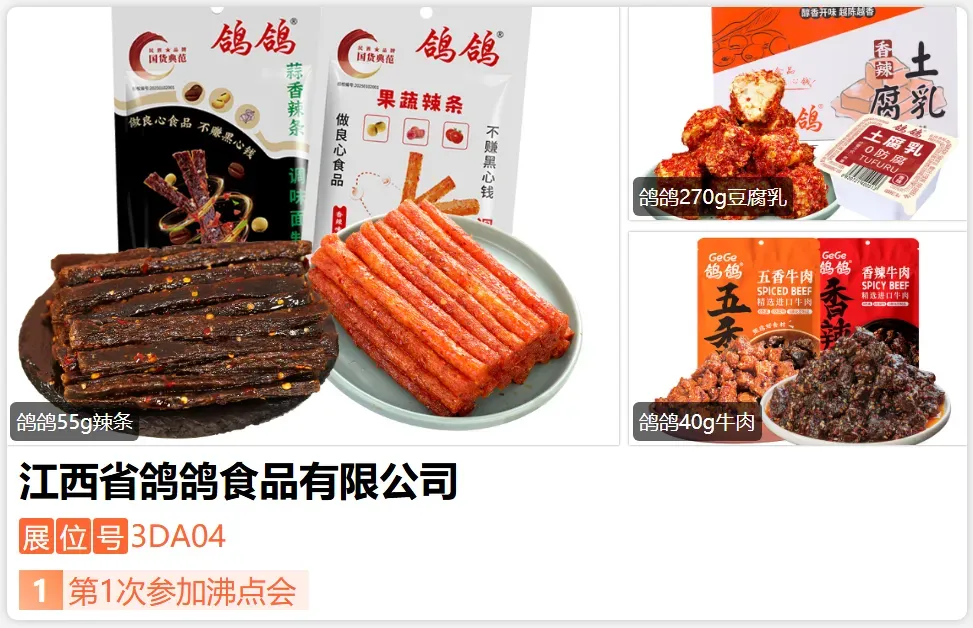 江西省鸽鸽食品有限公司成立于2006年,是一家拥有国家高新技术企业、是生产销售一体的休闲食品企业。自成立以来,鸽鸽食品一直坚持“做良心食品,不赚黑心钱,精选好食材,新鲜更好吃”的生产理念,先后开发出豆角干、牛肉干、辣条、酱干、豆腐乳等十几个系列休闲产品。鸽鸽食品占地面积100余亩,先后投资1亿多元,建成占地面积6万多平方米的现代标准化食品生产车间,现有员工300余人,年产值超亿元。-展位号:3DA21-