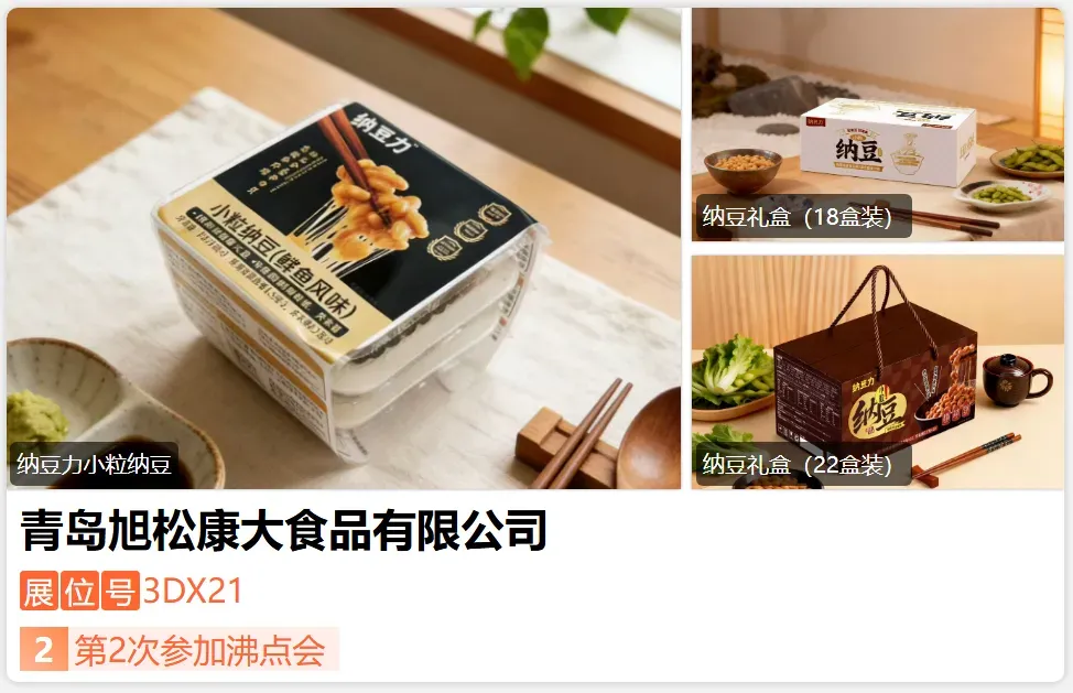 青岛旭松康大食品有限公司专研纳豆产品,已出口日本20余年,日本介护纳豆核心供应商。采用东北非转基因大豆-小粒豆、进口全自动发酵设备、活性封装发酵工艺,专研口感技术,无苦涩味无氨臭味,并取得了FSSC22000认证。-展位号:3DJ09-