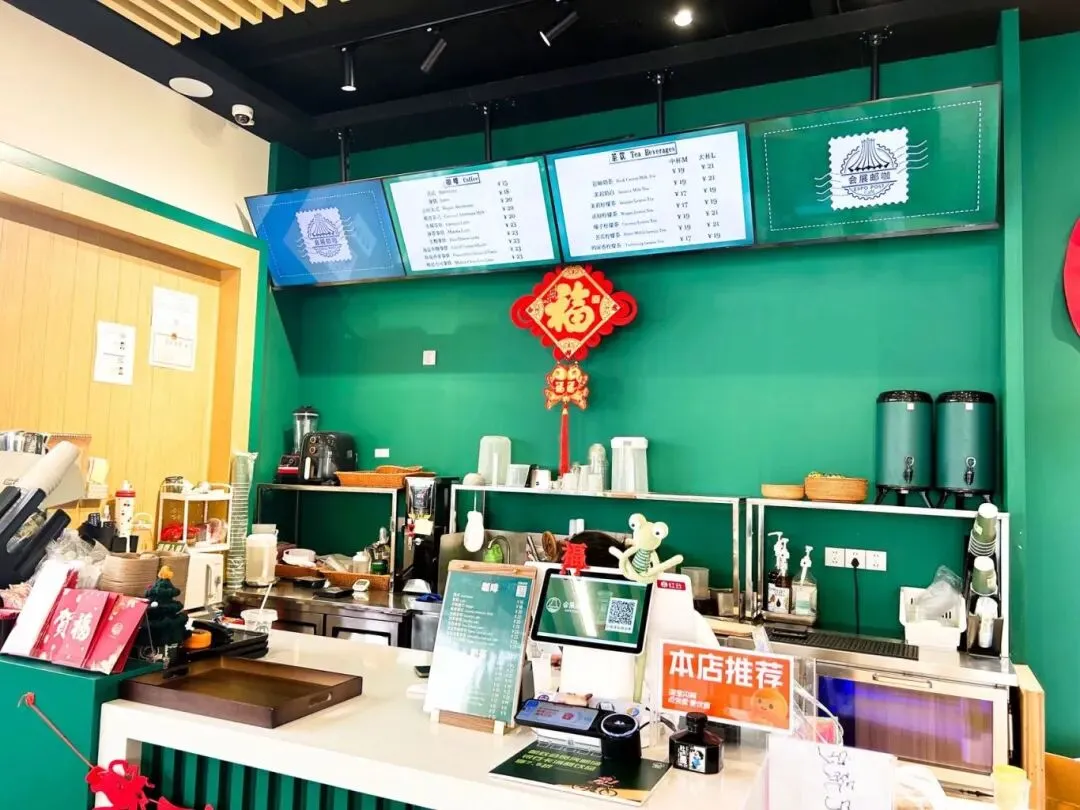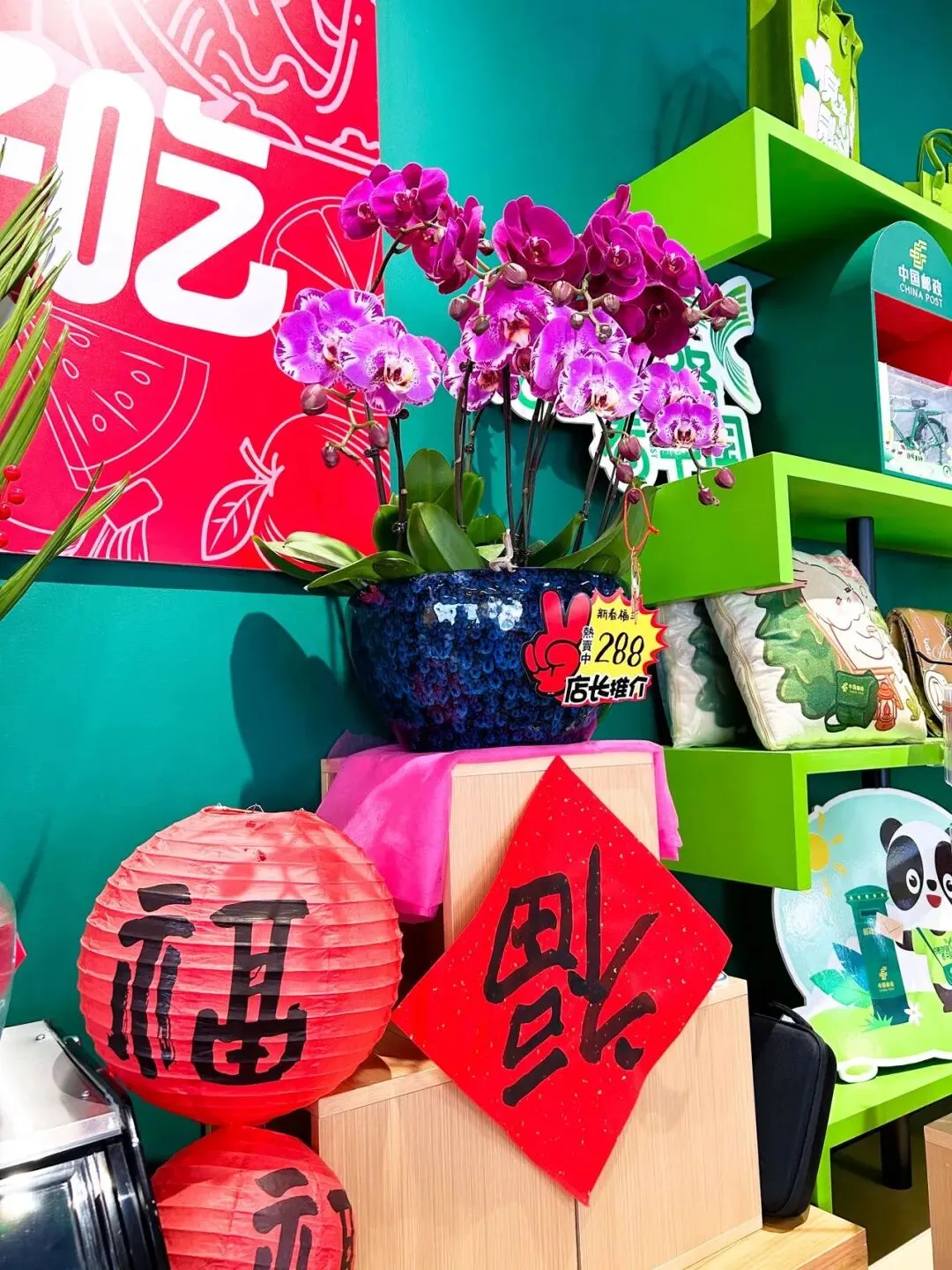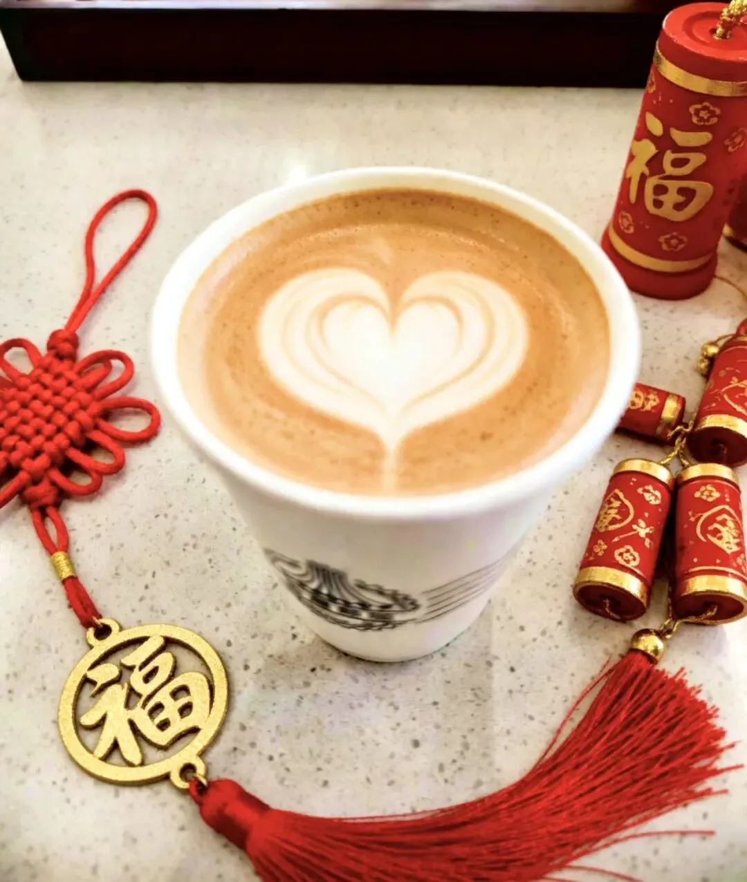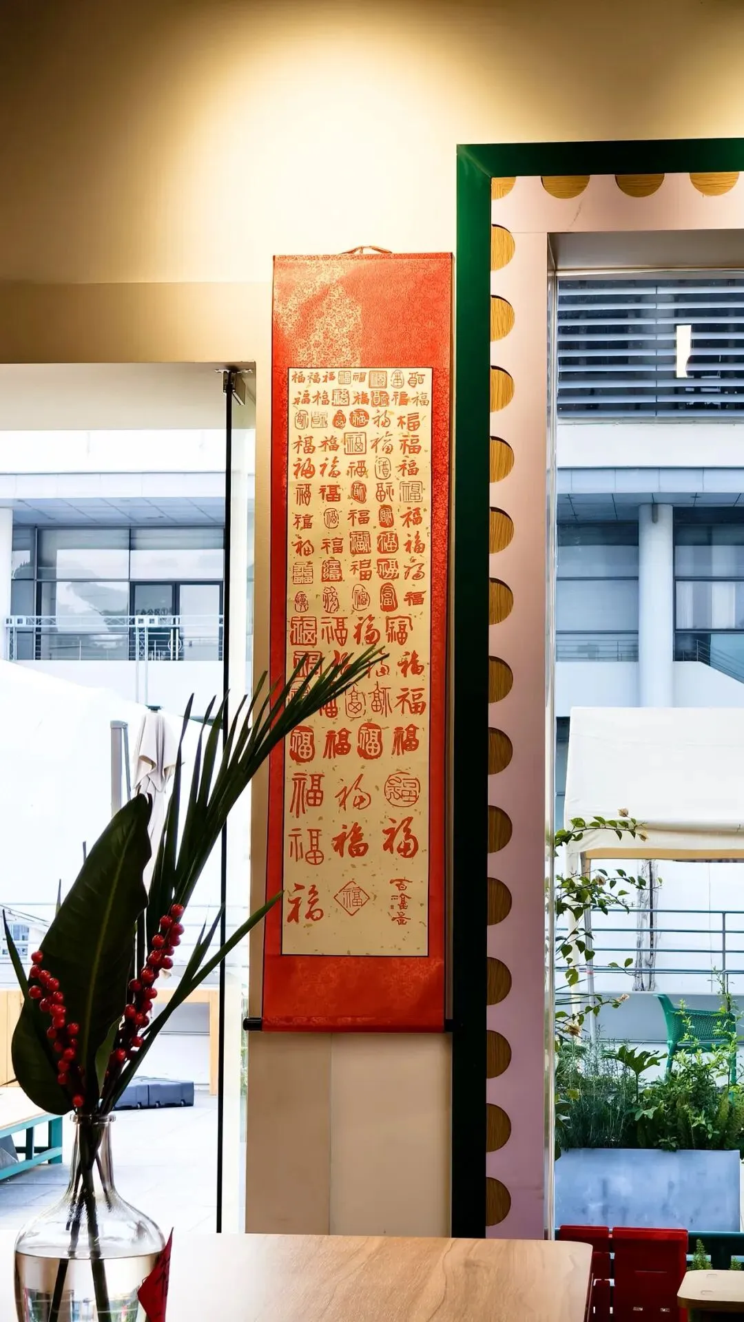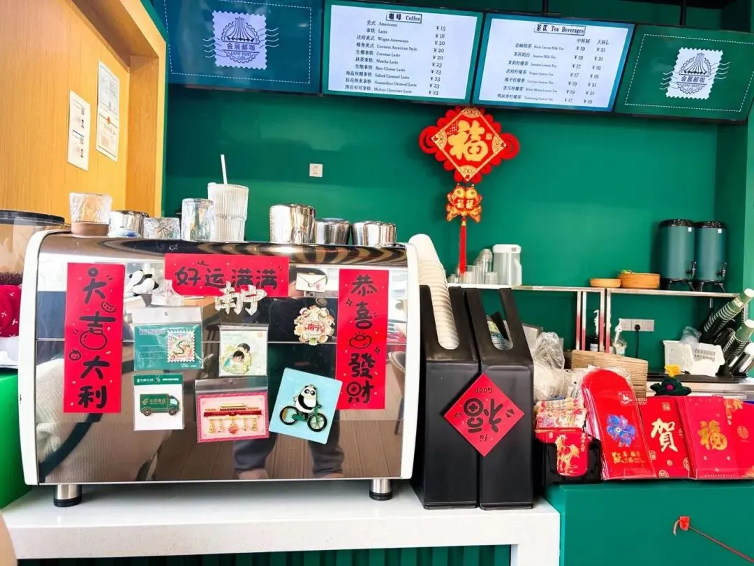 走进门店,最先撞入眼帘的是满墙满桌的“红”。百福图的折页上,朱红印章错落排布,每一个“福”字都藏着不同的吉祥寓意;绿植枝头,倒贴的“福”字与红灯笼相映成趣,就连柜台的咖啡机上都贴着“大吉大利”“好运满满”的春联,把新春的喜庆揉进了每一个角落。