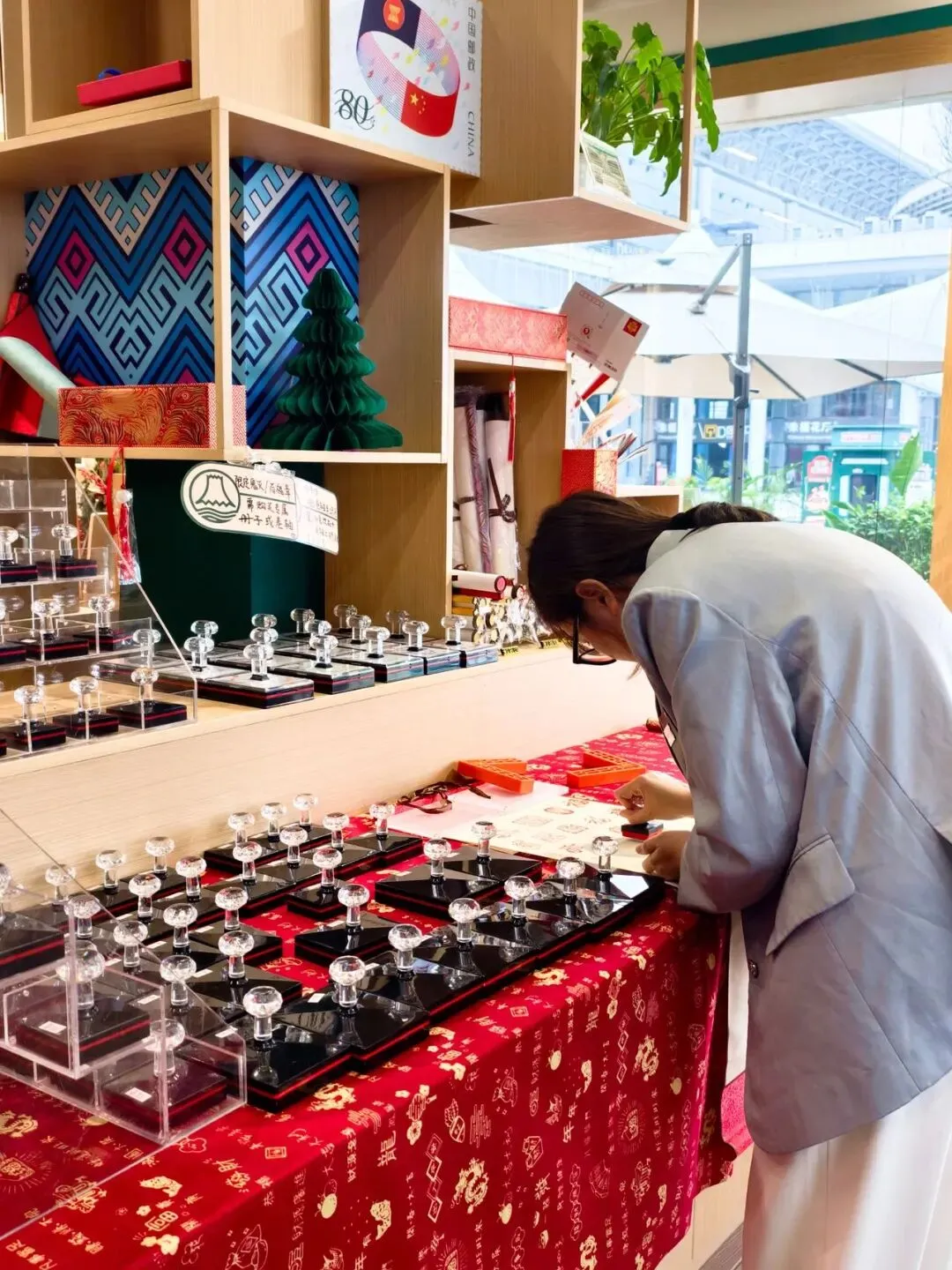 展台上,“骏驰同心 天马共鸣”的主题邮品整齐陈列,生肖元素与广西特色纹样交织,一张张贴纸、一枚枚邮票,都是写给新年的浪漫信笺。紫艳的蝴蝶兰开得正盛,翠绿的琴叶榕挂着红饰,中式花艺的雅致与邮政文创的底蕴碰撞。
