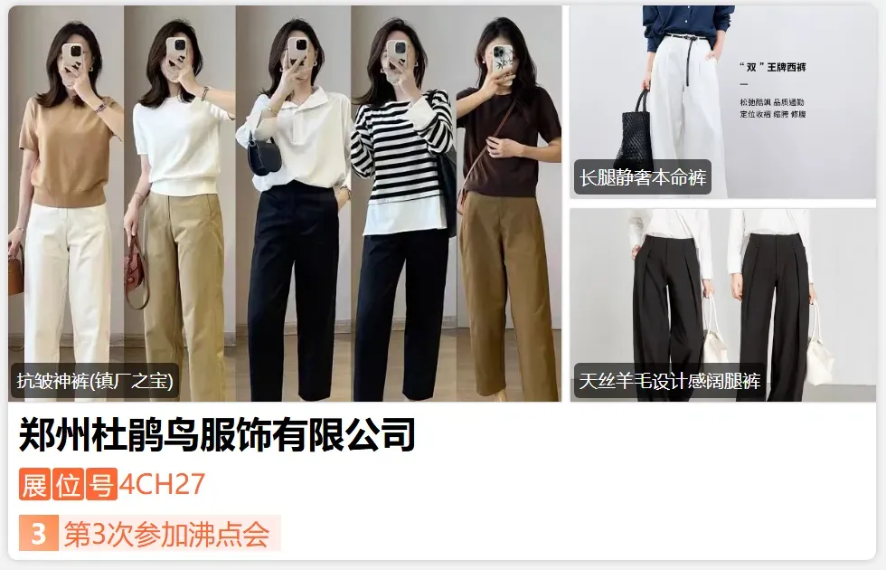 从织布到一条裤子,28年来,杜鹃鸟服饰专注只做原创高端品质女裤,年产100万条+,郑州女裤供应之最!杜鹃鸟服饰自注研发设计,销售,一体化公司,《当时最棒的魔术裤就是我设计的》。2012年线下专柜女裤转型供货给传统电商(唯品会、京东、淘宝、天猫),2020年因为疫情转型给直播和私域社群渠道供货-展位号:4CH26-