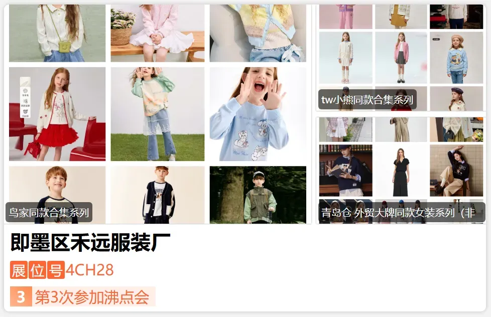 青岛即墨做了十几年的外贸童装女装工厂,近几年公司战略转做线上,主供直播和团购,工厂近年的产品研发方向会偏向于直播爆款和大牌同款系列 主做性价比。青岛即墨非常清楚私域适合什么产品,直播什么是爆款。-展位号:4CX03-
