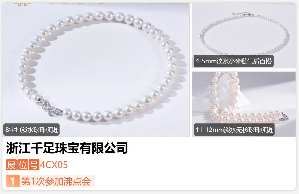 浙江千足珍珠有限公司创立于一九九七年四月,是一家集珍珠养殖、加工、设计、销售、进出口、科学研究、医疗保健开发于一体的、经国家八部委认定的珍珠行业农业产业化国家重点龙头企业。公司拥有现代化厂房,装备了国内外的生产设备,形成了从珍珠养殖、优化处理、项链首饰加工、精深加工等多条生产线,年加工珍珠能力稳居行业前列。-展位号:4CK05-