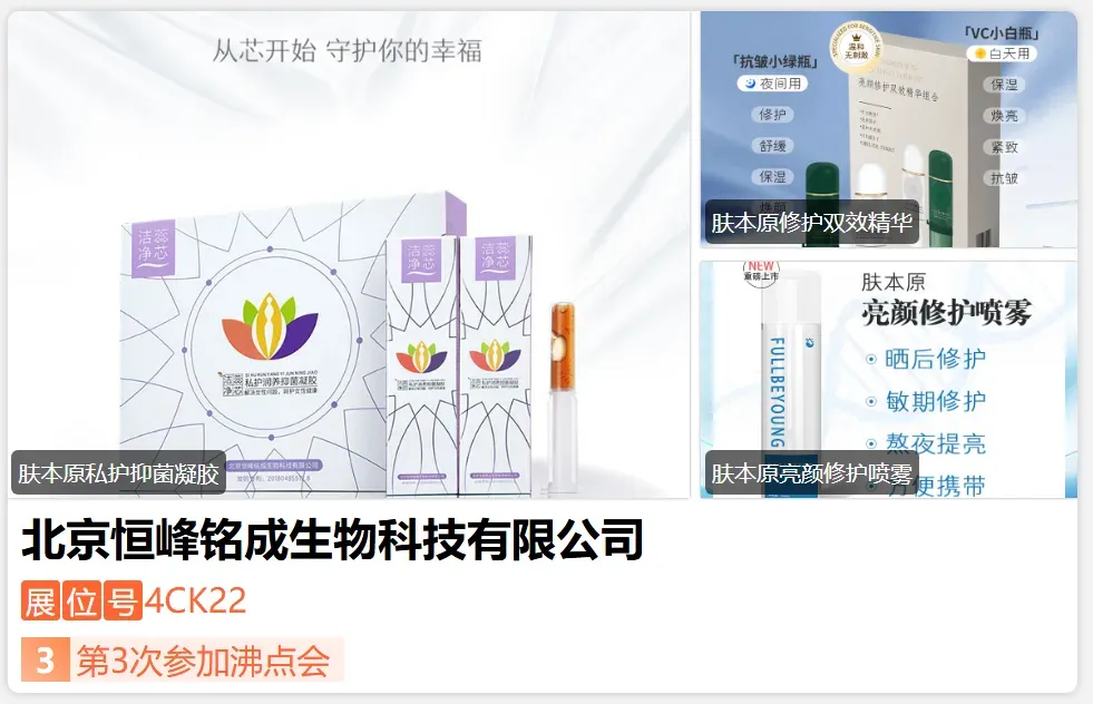 北京恒峰铭成生物科技有限公司成立于2016年5月,是一家聚焦干细胞药物研发及其衍生物研发的国家高新技术企业。并先后获得“北京市级企业科技研究开发机构”、“北京专精特新”等企业认证。公司围绕干细胞分泌产物开发的肤本原系列护肤品,通过透皮吸收技术,可直达皮肤基底层,对皮肤受损、皮肤老化、肌肤过度水合等问题有强效修护作用。-展位号:4CJ04-