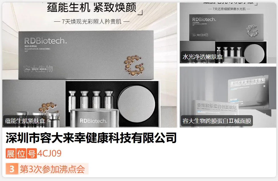深圳市容大生物科技股份有限公司是一家以生物技术为核心,以中医经络为基础理论,集研发、生产、销售、教育、服务为一体的***高新技术企业。依托容大健康研究中心的高新生物技术,凝聚生物基因工程学等各领域专家们多年研发的智慧结晶,容大生物实现了功能肽与现代生物科技在美容护肤品、亚健康调理领域的成功应用。RDBiotech.创建于2025年,是容大生物旗下细胞级护肤品牌。-展位号:4CH13-