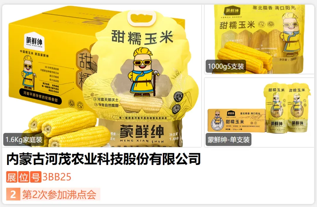 内蒙古河茂农业科技股份有限公司扎根于(塞上粮仓)内蒙古河套平原,在黄河边、阴山下。自有万亩种植基地,智能化加工厂,我们怀揣着对土地的敬畏和对河套甜糯玉米的挚爱,始终保持绿色有机种植,只种植非转基因品种,全程加工O添加,您尝到的不只是三分甜七分糯,更是北疆大地对新鲜的执念,我们用河套的日月精华重新定义鲜食玉米,锁住阳光的,何止是技术,还有对这块大地馈赠给餐桌美味的深情感恩。-展位号:3BY05-