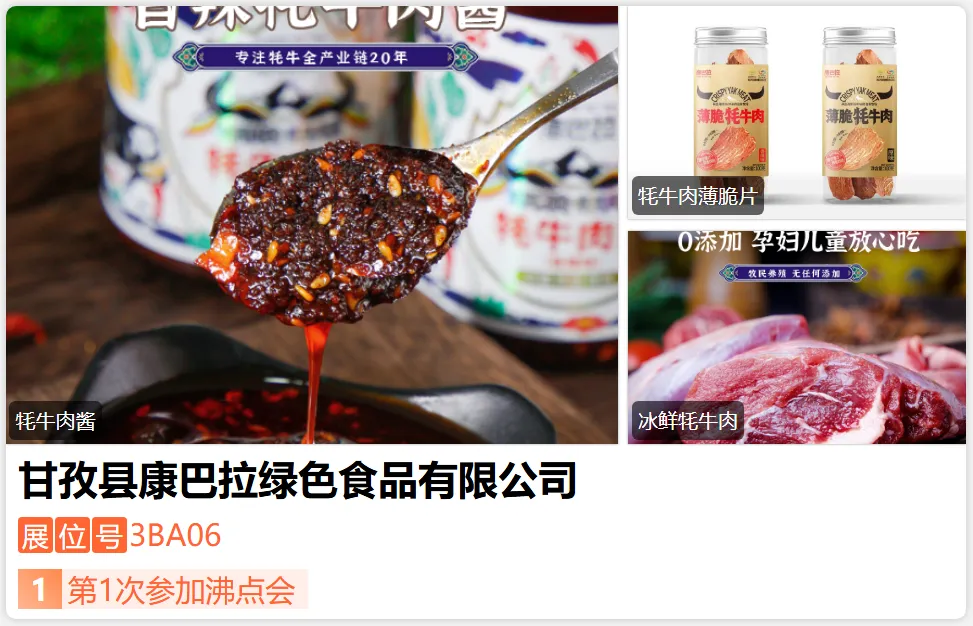 甘孜县康巴拉绿色食品有限公司主要从事牦牛养殖、屠宰、深加工、冷链仓储及销售,公司既是甘孜县牦牛现代农业产业园区的龙头企业,也是甘孜州牦牛产业集群的核心企业,同时于2021年被评为“农业产业化国家级重点龙头企业”,公司以发展生态、有机的牦牛肉及其制品为契机,全面实施“亚克甘孜+企业品牌”双品牌战略。目前已打造了名为“康巴拉”的牦牛肉系列产品品牌。主要产品为生鲜牦牛肉和牦牛肉精深加工系列产品。-展位号:3BC13-