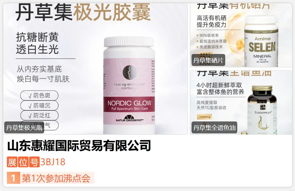 山东惠耀国际贸易有限公司成立于2024年,定位于健康管理领域,专注跨境电商进口医药业务。Natur-Drogeriet丹草集始于1945年,是北欧 最 大的膳食补充剂生产销售公司,产品拥有GMP 认证。产品目前在全世界60多个国家和地区销售。2010年被丹麦保健食品商店评为25年来最畅销产品。-展位号:3BJ26-