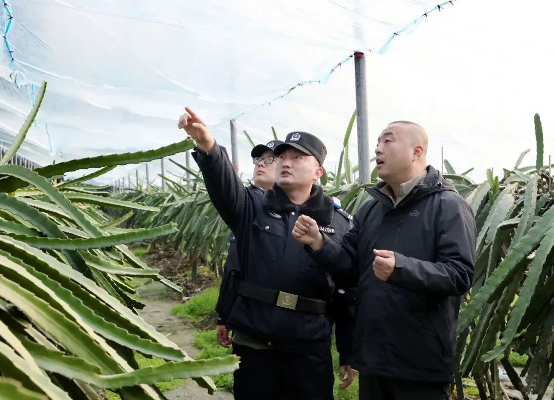 离园区不远的佳盛农场,火龙果大棚在冬日阳光下泛着暖光。大棚内温度适宜,“新农人”崔海川站在地头,把来走访的民警连峰、辅警冯郎迎进大棚。连峰问到:“老崔,最近轻松点了吧,能休息好了吧。”