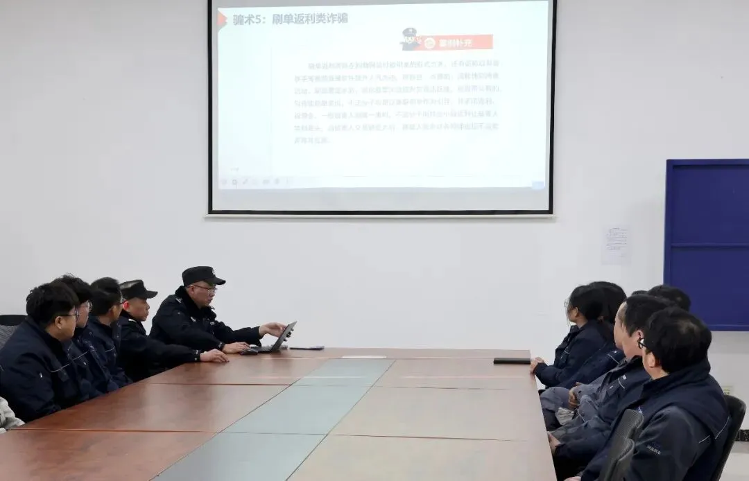 在监控室,薛志和企业的安保人员查看监控设备,重点查看之前发生过案件的区域。在车间的会议室和财务室,薛志向工人和财务人员开展反诈宣传:“年底是电信诈骗的高发期,咱们工人兄弟遇到亲友要求转账的时候,一定要核实。网购的时候不要打开陌生链接、不要告诉密码、验证码……特别是财务人员,一定要警惕冒充领导诈骗、对公转账诈骗。”他根据不同受众的具体情况,通过真实案例进行讲解,员工们听得津津有味。