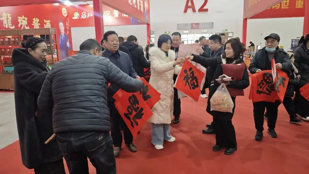 笔会现场红纸铺展、墨香四溢。书法家们挥毫泼墨,楷、行、隶、篆各体“福”字和春联笔力遒劲、寓意吉祥,吸引众多群众驻足欣赏、排队领取。墨香与笑语交织,红纸与笑脸相映,为年货节增添了一份浓厚的节日氛围。