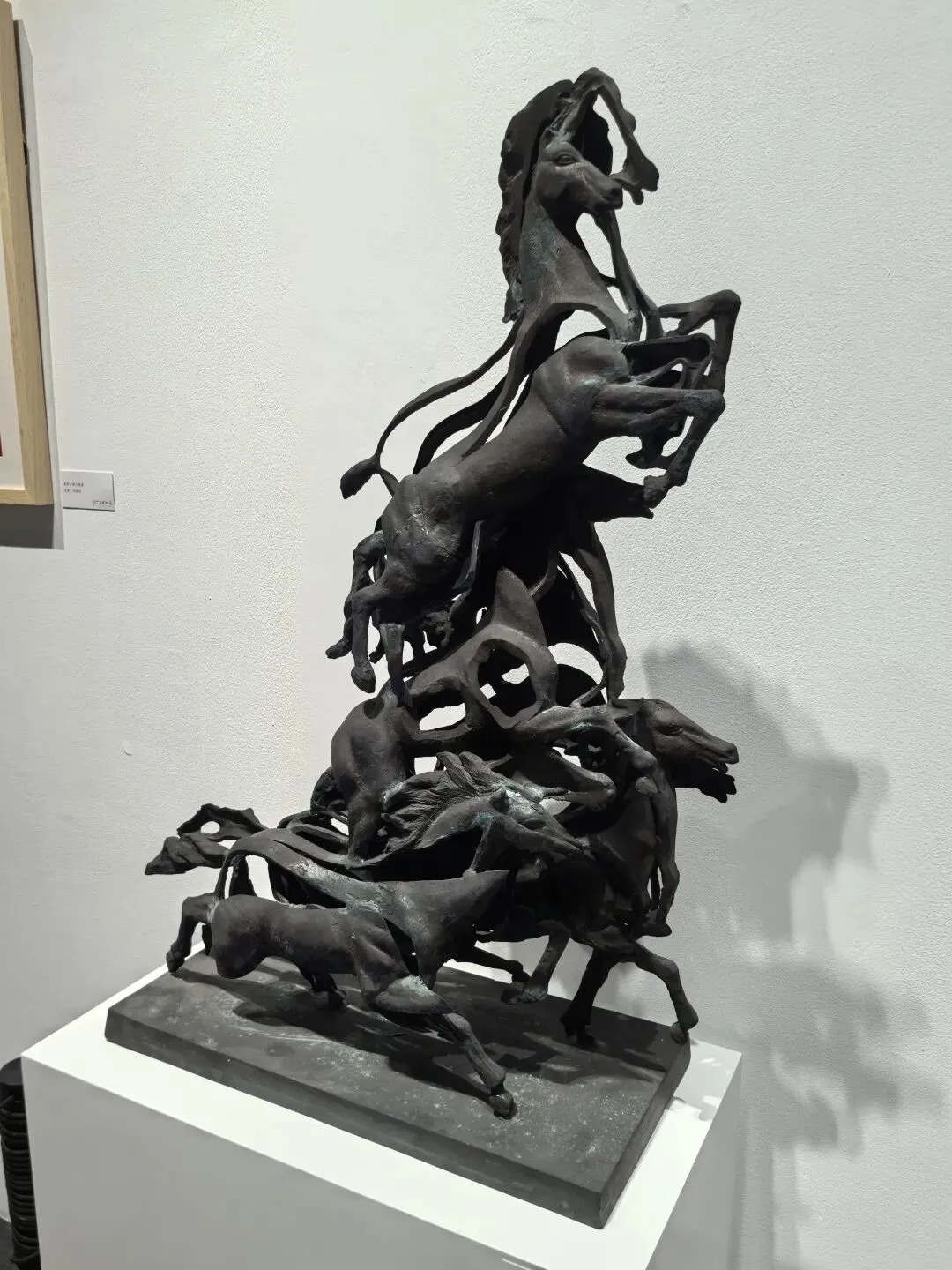 本次展览还特别呈现了雕塑作品。一尊以青铜为材的骏马雕塑,通过层叠交错的抽象线条,勾勒出骏马奔腾向上的动态。流畅的曲线与块面结合,既展现出材质的厚重感,也传递出运动的磅礴力量。