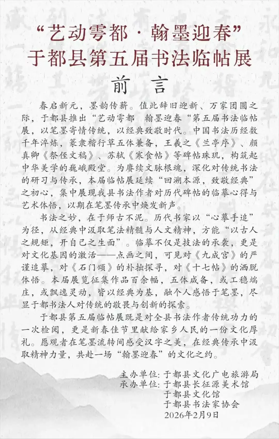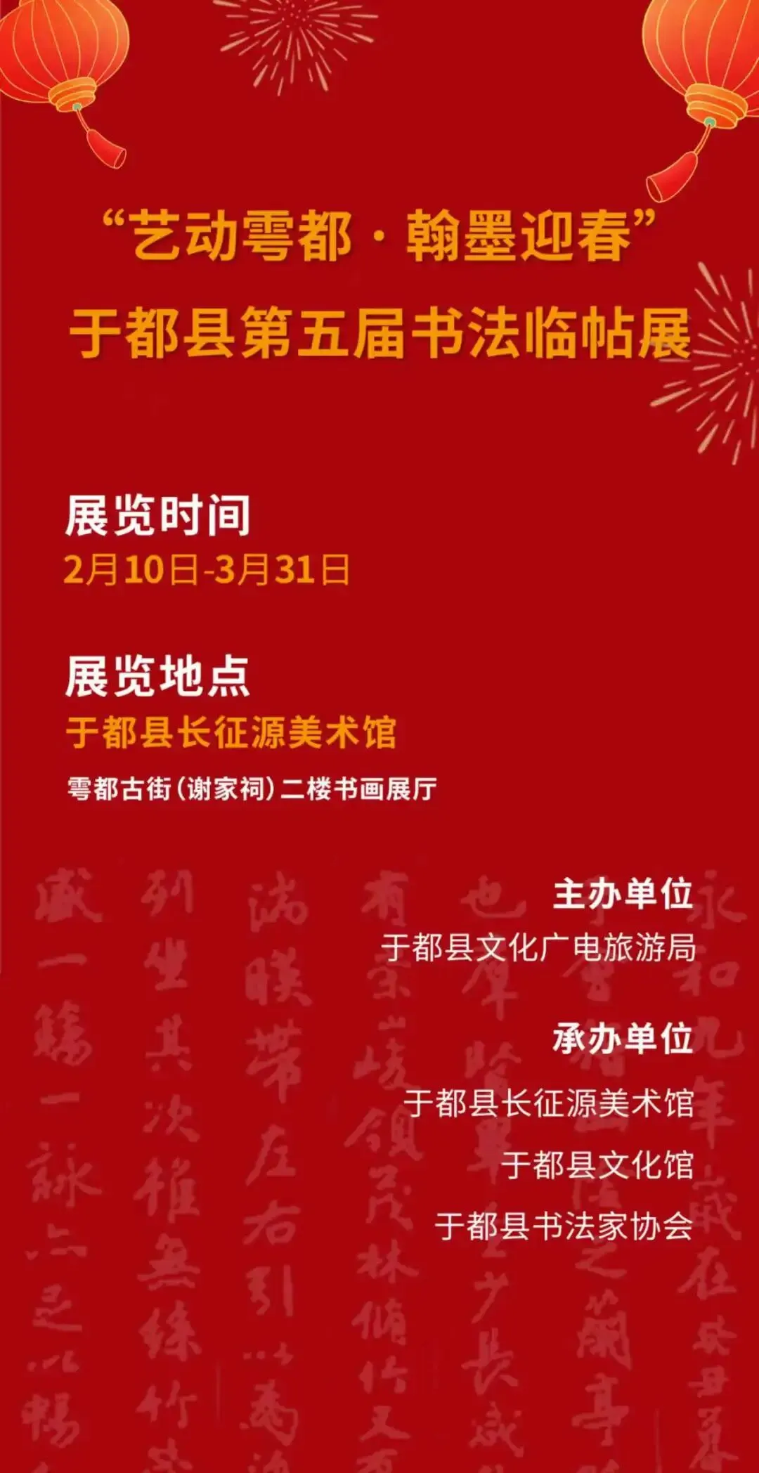 中国书法,历史源远流长,作为中华民族独特的文化瑰宝,历经数千年传承创造,形成了篆、隶、楷、行、草等丰富字体;诞生了王羲之、颜真卿等书坛巨匠;更流传下《宣示表》《兰亭序》《寒食帖》等不朽碑帖。值此辞旧迎新、万家团圆之际,为弘扬中华优秀传统文化,传承春节书写祈福的民俗传统,全面展示我县书法作者对经典碑帖的研习成果,鼓励广大书法爱好者以笔墨寄情,在墨香中传递年的喜悦,特由于都县文化广电旅游局主办,于都县长征源美术馆、于都县文化馆、于都县书法家协会协办,举办"艺动雩都・翰墨迎春"于都县第五届书法临帖展。