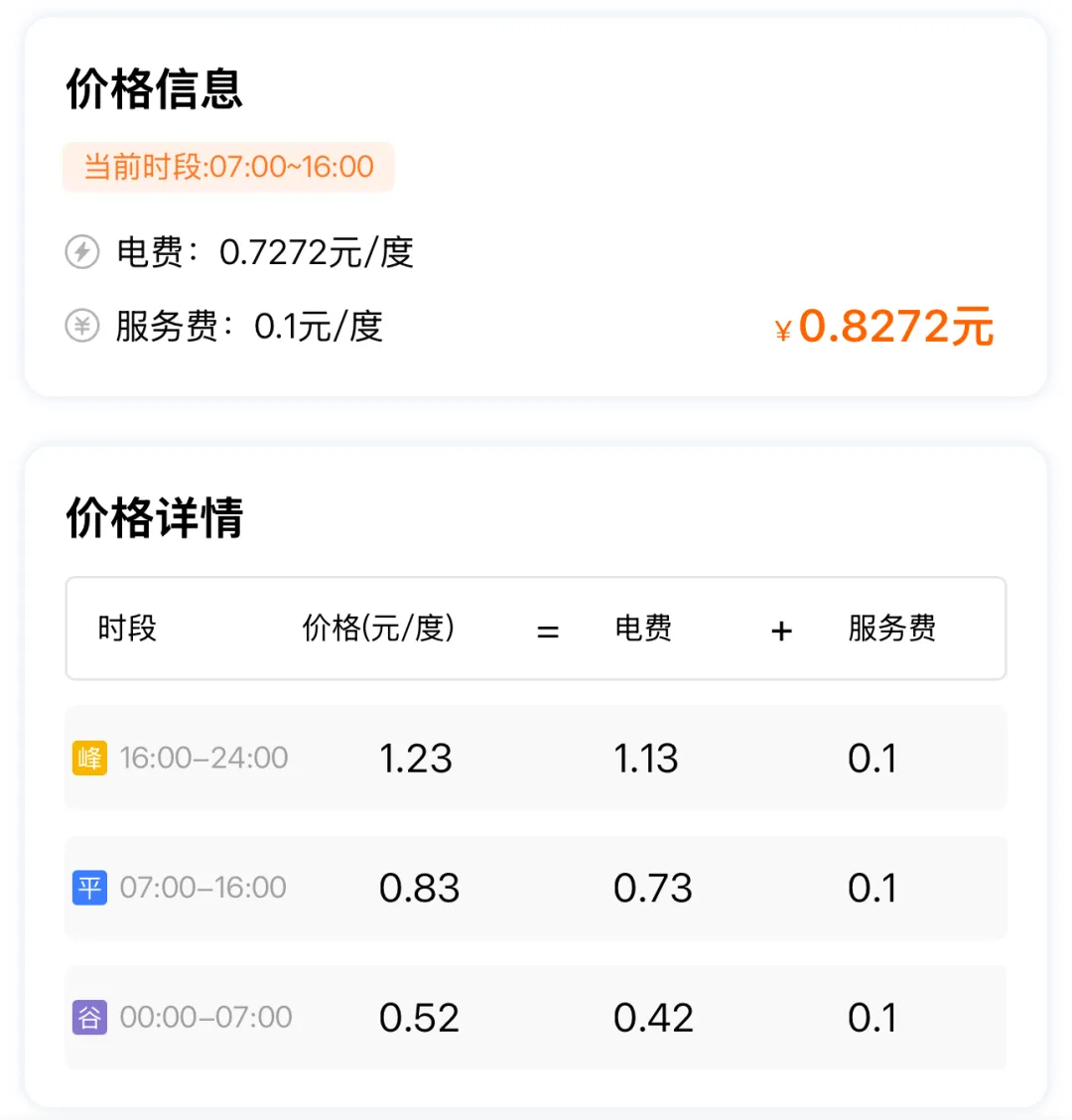 透明电价:执行透明的分时电价政策,明码标价:峰时段电费+服务费为1.23元/度,平时段电费+服务费为0.83元/度,谷时段电费+服务费为0.52元/度。此外,充电期间提供免费停车服务。