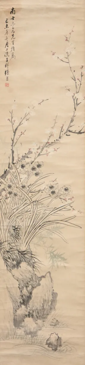 晚清社会的变革促使画家突破传统题材束缚,追求题材的丰富性与视觉的新奇感,以适应市场需求与审美变化。因此,作为海派代表人物的张熊,选择跳出传统框架,用清雅水仙取代苍劲青松,以 “水仙、梅花、竹子、山石” 组成画面。水仙素有 “凌波仙子” 之称,叶姿清秀、花香淡雅,象征 “纯洁无瑕”;又因 “仙” 字谐音,自带 “吉祥如意” 的世俗寓意。如今再看张熊的这幅《花卉》图,水仙凌波、梅香浮动、竹影婆娑、山石嶙峋,共同构成了 “吉祥、清雅、坚韧” 的新象征体系,既保留了文人画的精神内核,又融入了世俗文化的审美趣味。他的艺术实践,为晚清画坛开辟出了第三条道路:既非坚守文人画孤高传统的“遗老派”,也非完全迎合市民趣味的“俗化派”,而是以“雅俗共赏”为宗旨的“中间路线”。