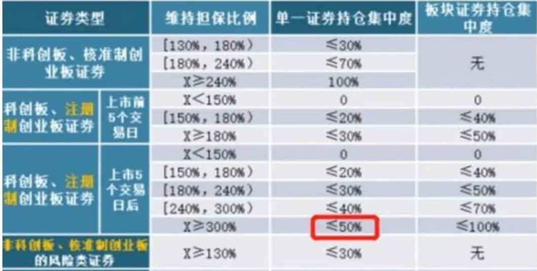 :不同维持担保比例,对单只股票持仓占比有限制;维保比例>240%,才可 100% 资金买单一股票。 - 双创板块(科创板 / 创业板)额外限制